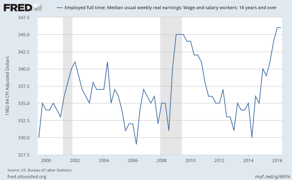 Weekly Earnings Published 28 July 2016 at 3168 × 1964 in Spring is Coming! ← Previous Next → Weekly earnings by workers, adjusted to 2016 dollars. Data from the St Louis Federal Reserve.
