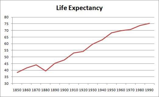 Life-expectancy-US-1850-1990 Published 31 July 2016 at 521 × 318 in Progress and History US Life expectancy. From Historical Statistics of the United States, Millennial Edition, 2000.