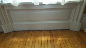 As it was all re-assembled, the pieces came together slowly. The trim had to be reconstructed, but there were clues still present. For example, the windows on the main floor were originally trimmed like doors, going all the way to the floor with a classic plinth block to rest on. The space under the sill had a panel. Only the dining room had this completely intact, but there were enough clues to proceed. The panels were fashioned on a cheap table saw in the basement based on the dimensions from door panels. The trim was a combination of new millwork and reconditioned old red pine pieces.