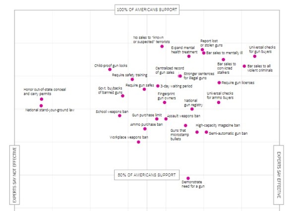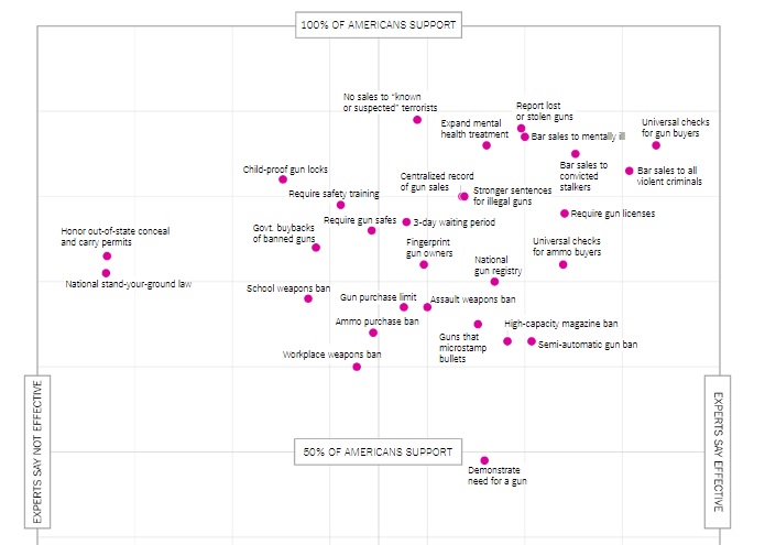 “Expert” opinion of effectiveness, x-axis, versus popularity, y-axis, for various proposed gun law changes. Note that it includes proposals from across the political spectrum.