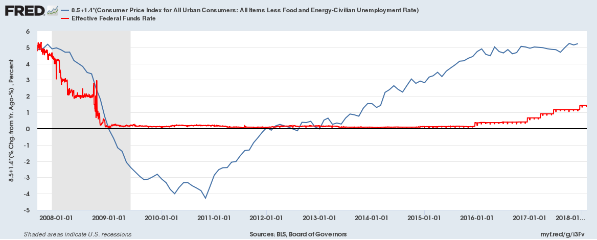 The actual Fed Funds Rate in red, with the Makiw estimation in blue. Note that it only goes up from here.