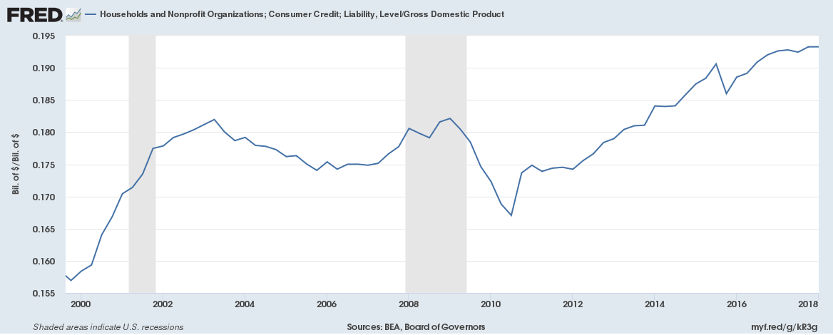 The chart below shows net consumer credit divided by GDP since the start of the last Depression. Notice a clear trend: