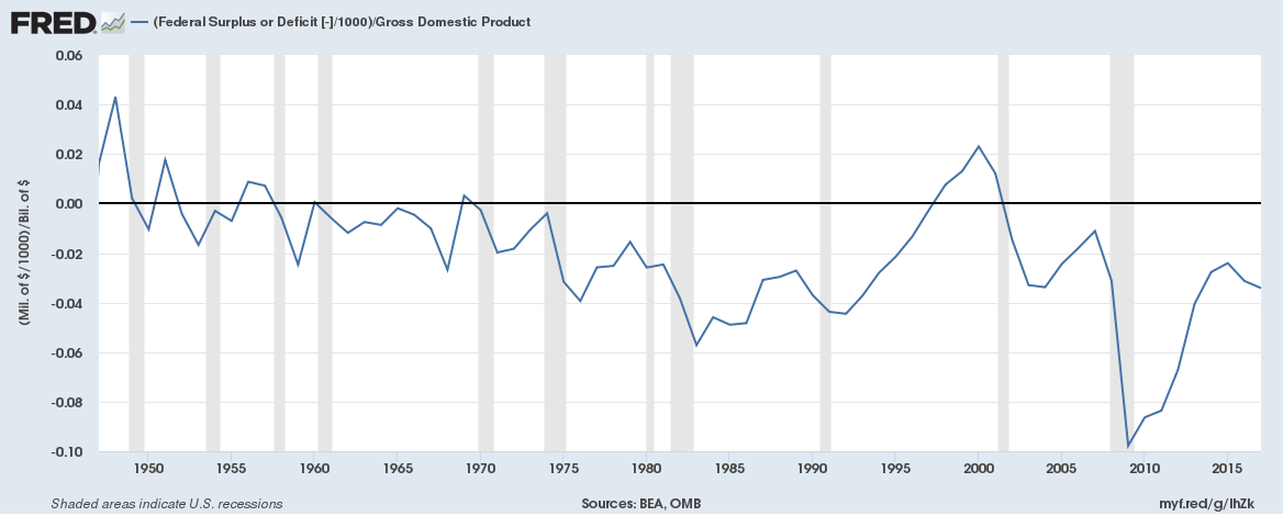 As time went on, however, it became more red. As the Vietnam War took more resources, deficit spending mounted in the 1960s. Coupled with the recession of 1974, it reached 4% of GDP before climbing back towards zero.