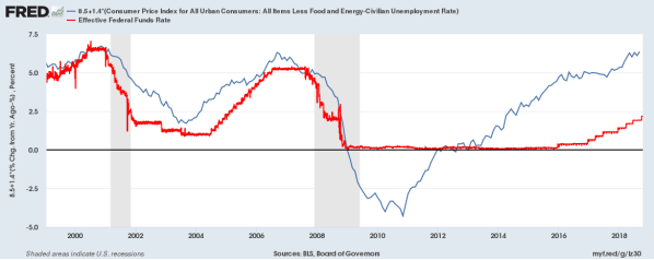 Fed Funds Rate in red and Mankiw Estimation in blue, since 2000. The gap is huge and has been for a long time, signaling inflation.